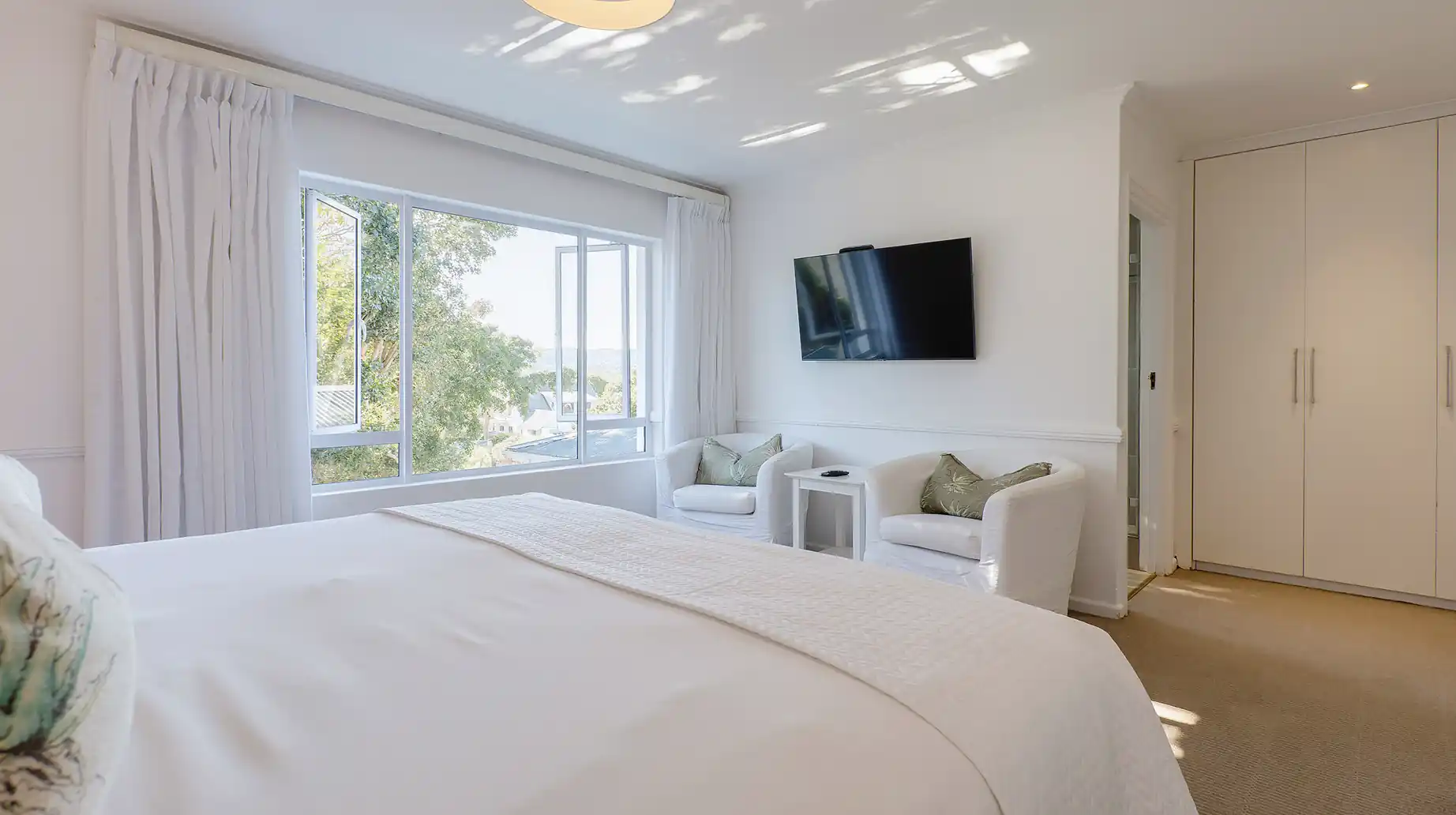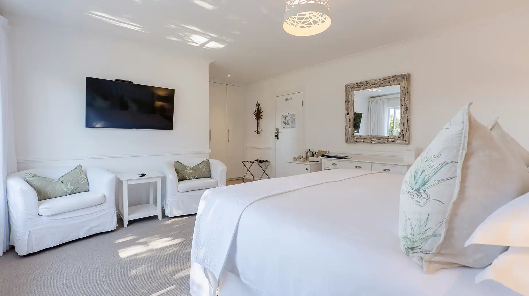 The Aloe Suite is a newly decorated first-floor room overlooking the landscaped garden. Designed for two adults, it features luxurious fabrics and fine linens, creating a light, welcoming atmosphere. Every detail has been considered to offer a calm and comfortable space for relaxation and gentle moments of pause.