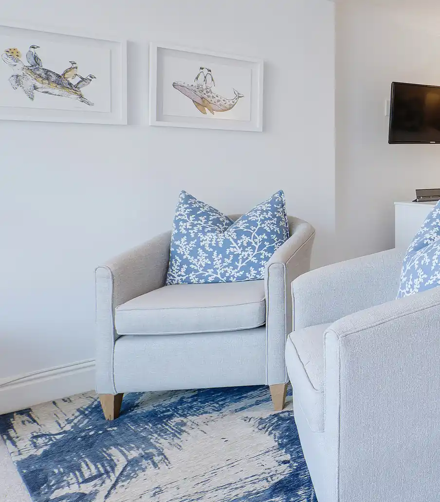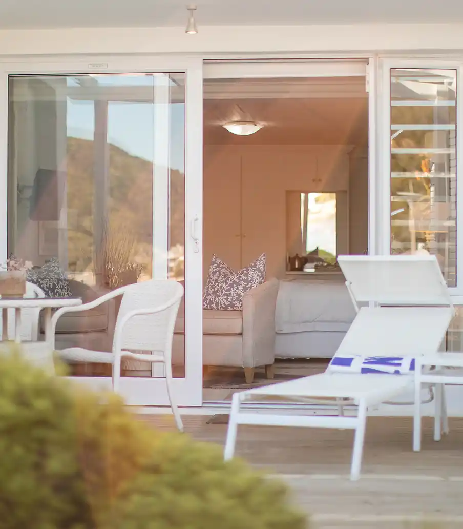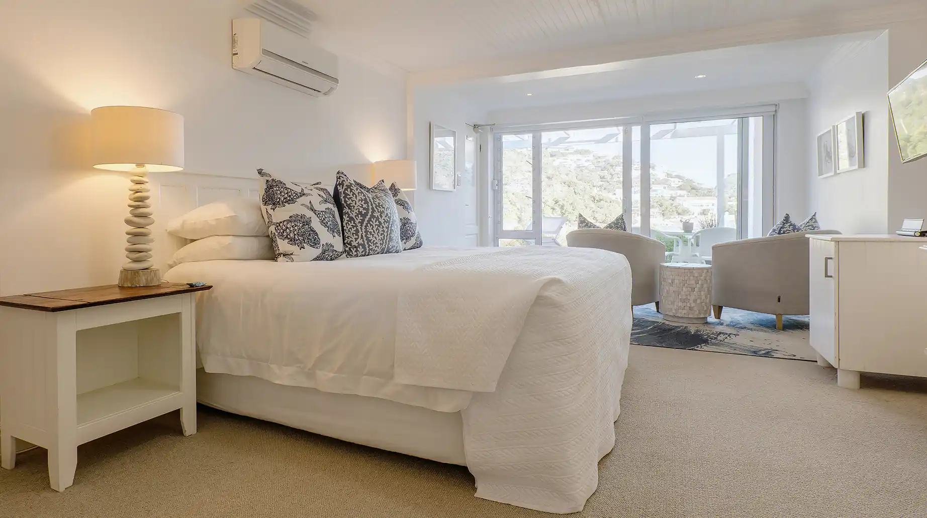 Comfortable and inviting, the Whale Suite offers a peaceful retreat for couples seeking rest and relaxation. Located on the ground floor, it opens onto a private deck with loungers and sweeping views of the lagoon and Knysna Heads. A serene space to unwind and enjoy the natural beauty of the surroundings.