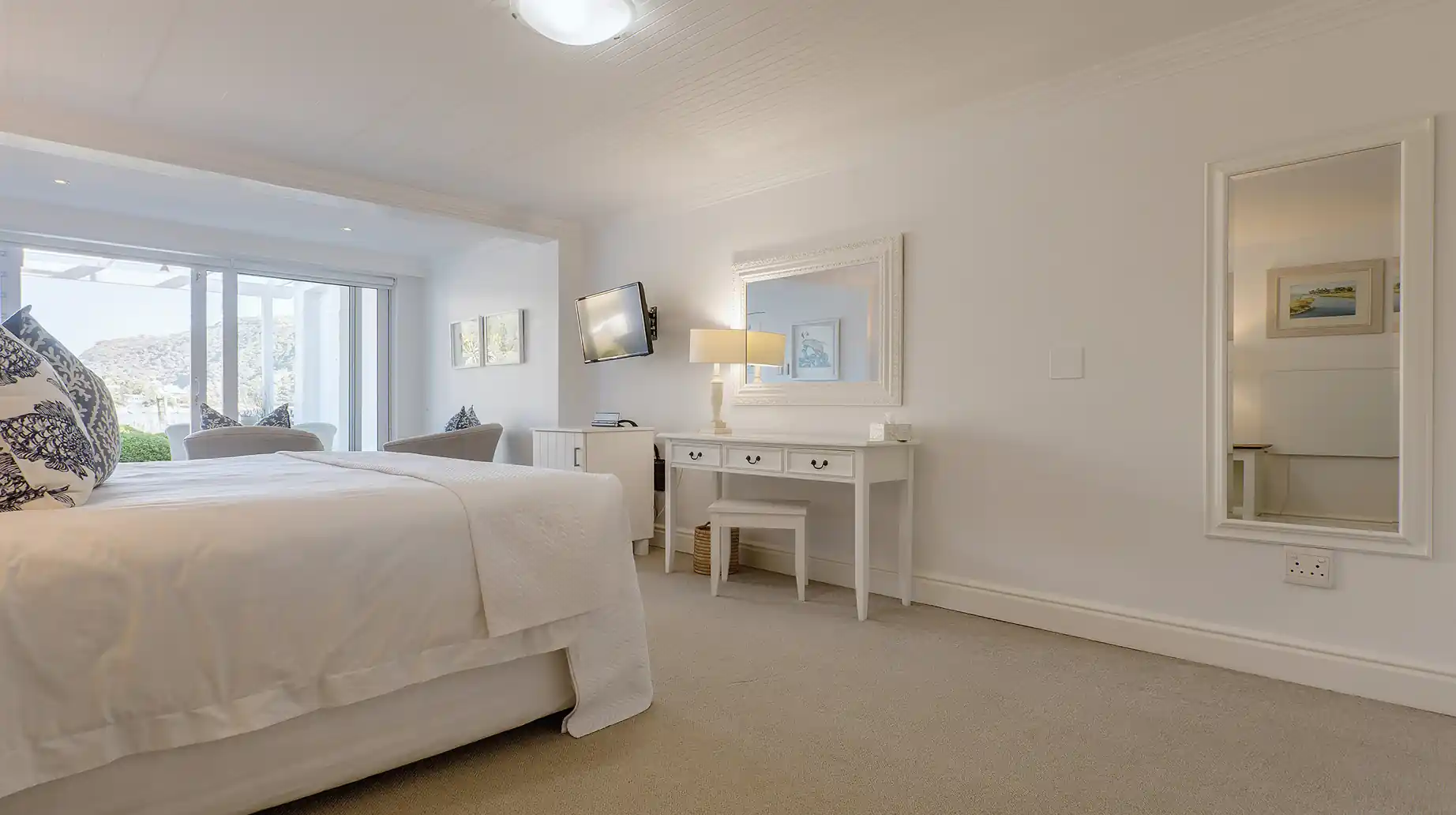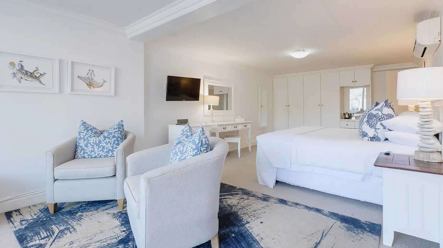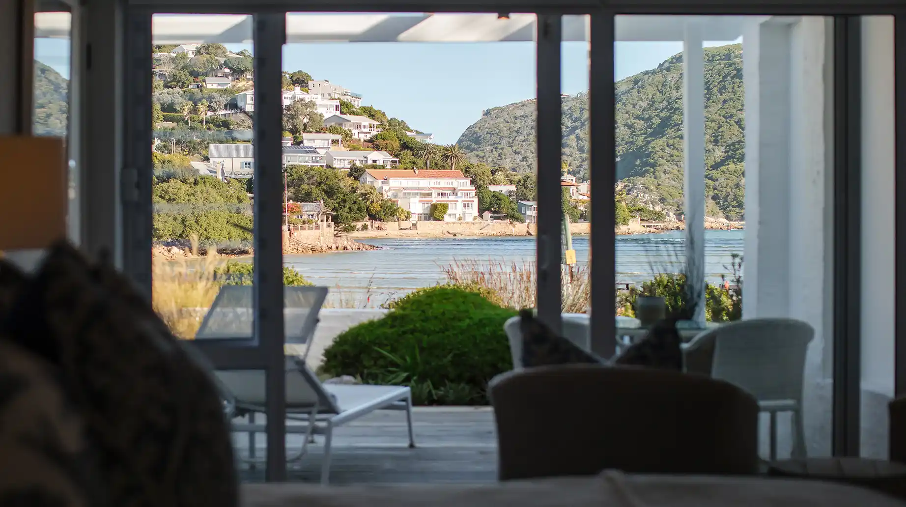 Comfortable and inviting, the Whale Suite offers a peaceful retreat for couples seeking rest and relaxation. Located on the ground floor, it opens onto a private deck with loungers and sweeping views of the lagoon and Knysna Heads. A serene space to unwind and enjoy the natural beauty of the surroundings.